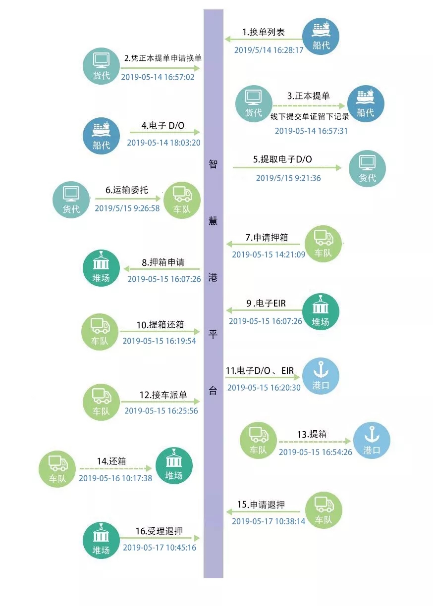 今后收货方仅需将收到国外的正本提单交到船代手中,之后的操作全部可以通过线上完成。码头、船代、货代、拖车公司以及货运场站等物流链参与方在平台上以电子信息流方式完成单证传递、运输委托、提箱预约、押箱还箱等全流程操作。各参与方的信息流在智慧港平台上汇聚,由平台对信息进行处理及传递,线上操作实时对接,线下货物快速提出港区。真正为企业做到了时间成本、人力成本、物力成本的同步降低。