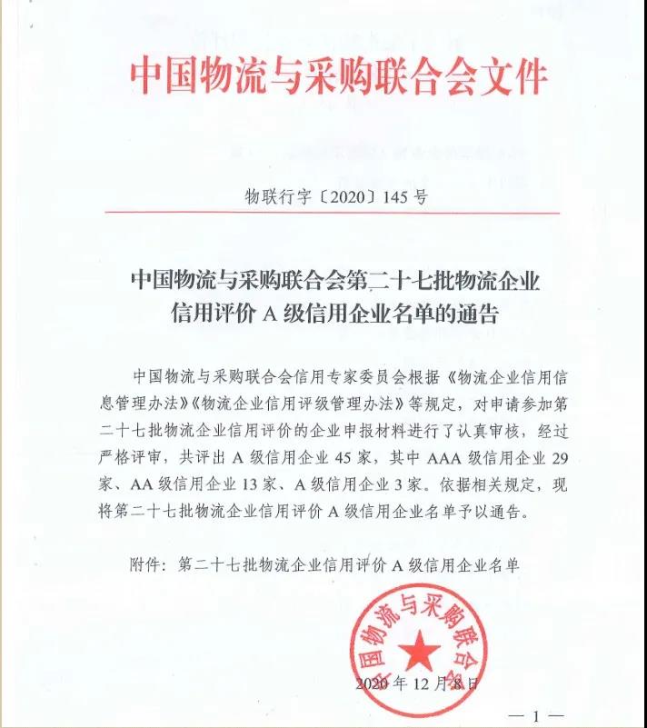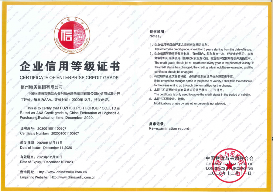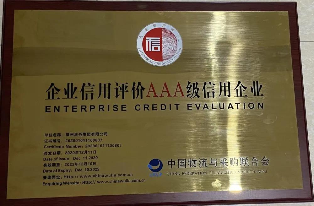 12月8日,中国物流与采购联合会公布了中国物流与采购联合会第二十七批物流企业信用评价A级信用企业名单。福州港务集团获得最高等级AAA级信用企业。