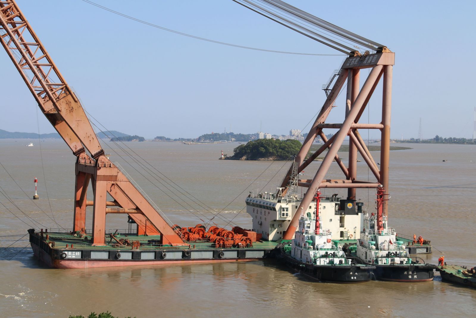 “秦航工65”船是为福州长门特大桥进行钢箱梁吊作业的工作船,此次作业区金牌门航道是出入福州港闽江口港区的必经之路,仅有160米宽,航道水纹环境极其复杂,大体积的钢箱梁更增加了施工风险,使得作业过程中必须封港。为了保证安全高效的完成任务,福港拖轮事前积极配合海事局、施工方,精心研制作业方案,并派出经验丰富的船舶护航,准时有效地保障了钢箱梁安全运抵现场、顺利吊装到位,在助力福州长门特大桥工程有序推进的同时也为福港拖轮拓宽了新业务领域。
