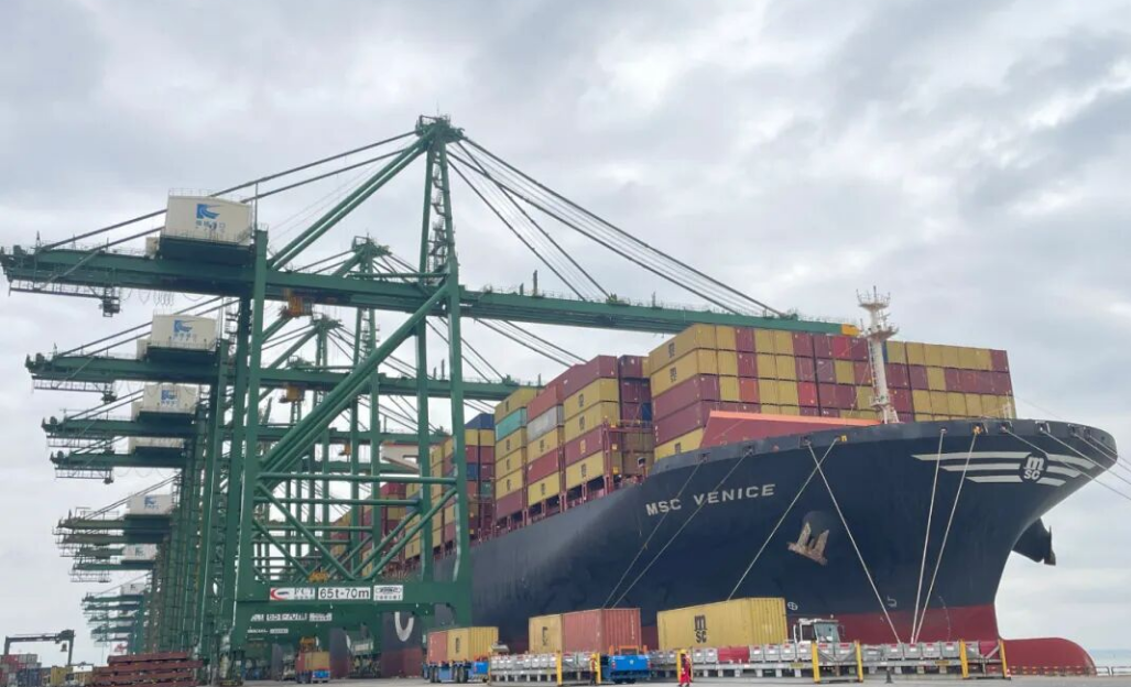 2月16(除夕)“地中海威尼斯”轮靠泊作业 (供图:张小龙) 除夕当天,20万吨级巨轮“地中海威尼斯”轮顺利靠泊,完成操作量1.3万标准箱,创下单船集装箱作业量的历史新高,为新年生产奏响精彩的“开门乐章”。同日,达飞轮船日菲航线本月内第三次挂靠,后续有望实现固定班期运行;马来西亚线、印巴线等多条外贸干线相继开展作业,国际航线网络持续加密,福州港外贸运输通道的通达性与稳定性显著提升。
