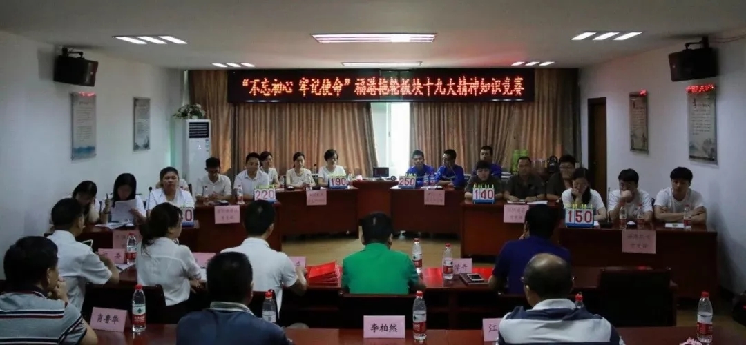 为深入推动学习贯彻党的十九大精神进港区、进班组。8月7日上午,福港拖轮党总支组织开展了一场冲劲十足的知识竞赛活动,展示了学习的快乐和知识的魅力。本次知识竞赛主题为“不忘初心跟党走 牢记使命为人民”,共有六支队伍参与竞赛,分别为各港区党支部代表队以及作为特邀助赛的福港机关中层干部代表队。比赛分为必答题、抢答题和风险题,现场有条不紊、气氛热烈。经过激烈角逐,闽江口内港区党支部代表队拔得头筹,罗源湾港区党支部代表队和湄洲湾港区党支部代表队分获第二名和第三名。