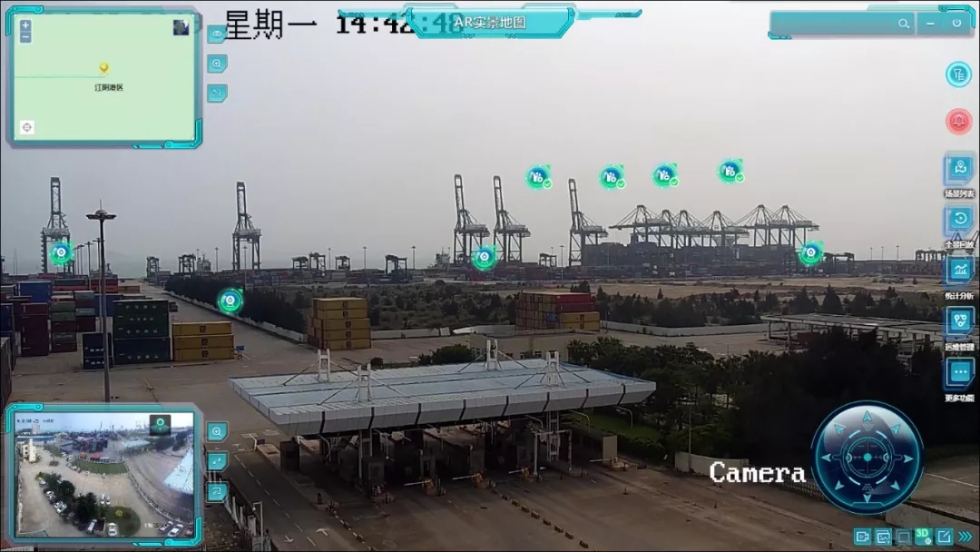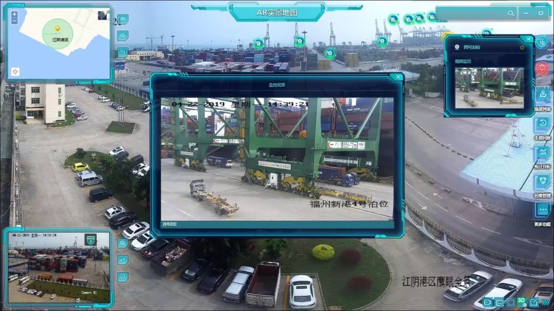 “智慧港口”实现既关注整体又兼顾局部的大范围立体监控模式,构建最先进的AR实景作战指挥平台,远程通过AR全景摄像机获取的江阴港区实时全景视频,方便生产调度人员对作业线进行实时指挥,作业方式调整等,已成为港区作业指挥的一种先进手段。