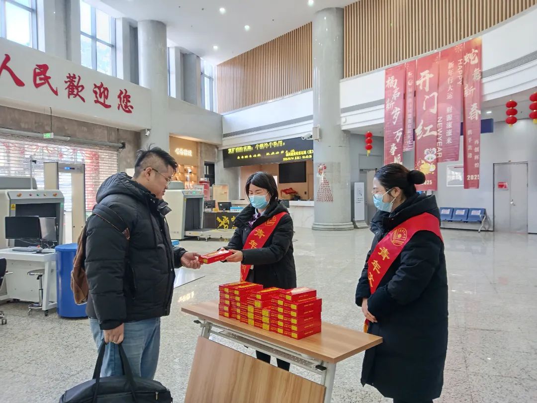 客运站组织开展“新春送福”活动,一群身披青年文明号绶带的志愿者正在为旅客送出新年伴手礼。寓意吉祥的新春对联、中国结等礼品不仅受到现场旅客的广泛称赞,也表达了对新的一年两岸团圆和谐、事事如意的美好愿景。