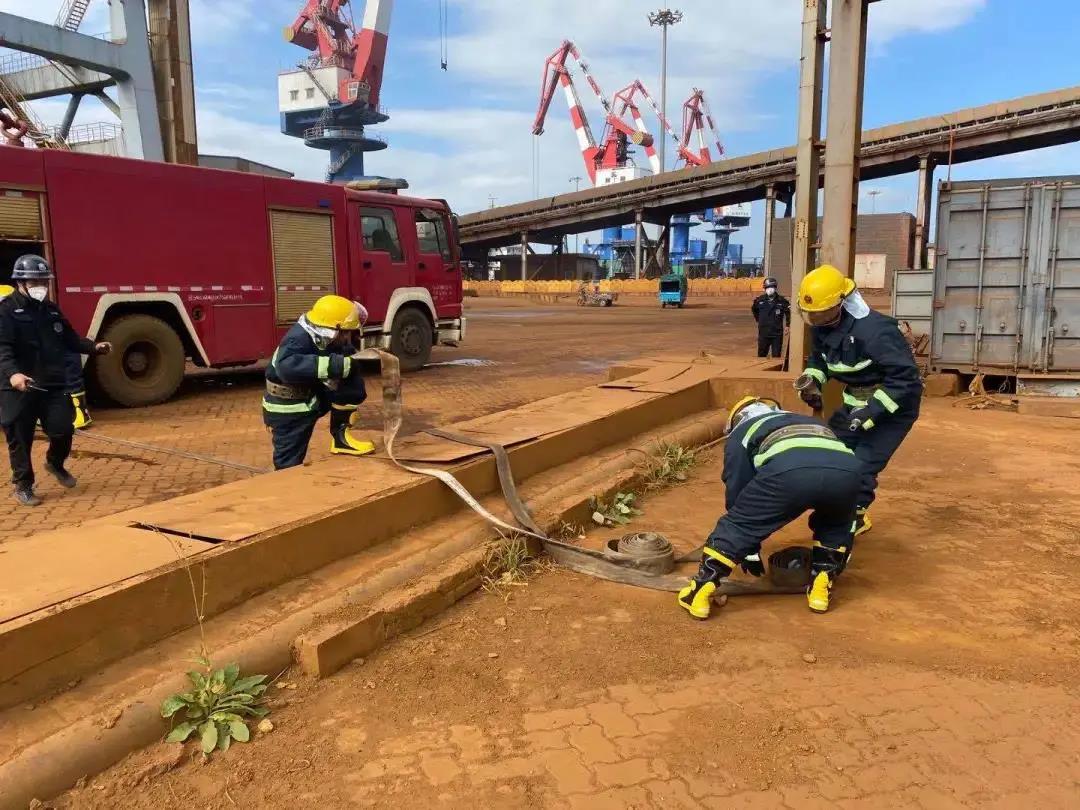 现场模拟4#泊位码头前沿三号皮带机转换房异物燃烧引起火灾,应急指挥部、安全监督部、生产操作部、技术设备部和义务消防队共计19人参加。通过调度中心视频指挥和现场实操,各部门相互配合积极响应,整个演练紧张有序,顺利扑灭火源。应急响应结束后,召开会议总结经验,各单位积极交流演练中的不足之处,提出改进措施,完善实施救援和处置事故的细节。
