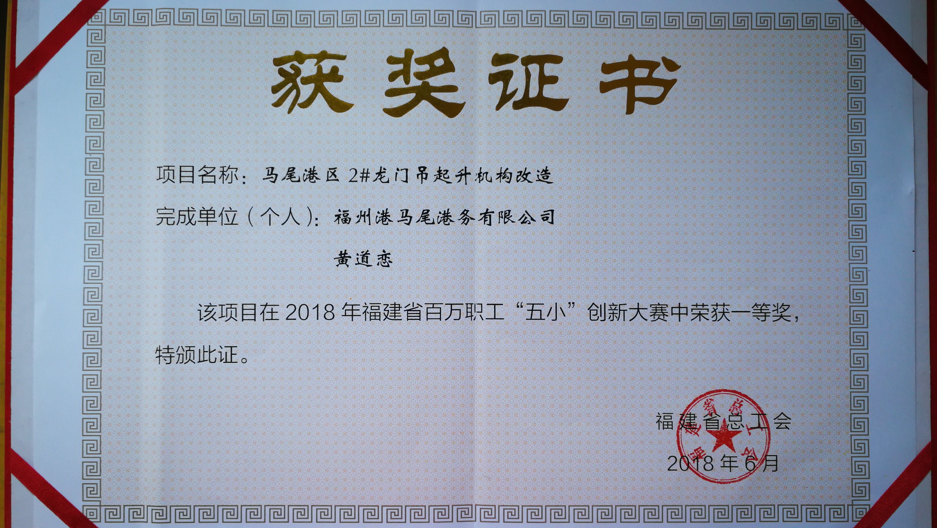 6月18日,福港马尾“五小”创新多项成果在2018年福建省百万职工“五小”创新大赛中获奖,并在福建会堂国际厅由中华全国总工会主办、福建省总工会承办的“大国工匠——高技能领军人才论坛”上受到表彰。其中,马尾作业区的2号龙门吊起升机构改造项目和松门作业区的2号门机回转制动器改造项目等两个成果,获一等奖;青州作业区的港口40T门机大车制动器改造项目和松门作业区的2号3号门机行走防撞限位设计安装等两项成果,获二等奖;琯头作业区的叉车货架革新制作项目和马尾作业区的40T门机起升电机转子碳刷架改造项目等两项成果,获三等奖。马尾作业区技术人员黄道恋代表获奖项目带头人,前往参加颁奖仪式,并隆重接受奖状。