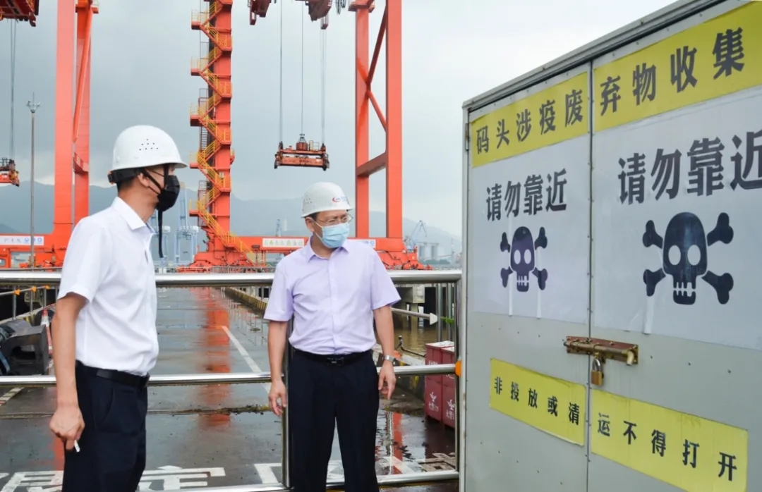 8月3日,福建省生态环境厅党组书记、厅长付朝阳率调研组一行深入福州港青州港区调研疫情防控工作。调研组通过实地走访、现场巡视,详细了解了港口内外贸货物、集装箱、冷链运输等作业流程,听取了疫情防控、环境保护工作开展的总体情况汇报,重点检查了包括涉疫废物的规范暂存和处置、暂存时间和处置台帐、接收运输环节、设施运行风险、人员安全防护和处置物资储备等。