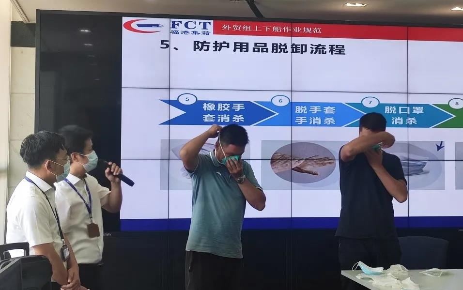 江阴港区迅速成立登临国际航行船舶作业人员和冷链查验作业人员专班队伍,执行工作住宿“两点一线”工作制,实施在岗集中管理、离岗集中观察、居家安全监测“三段式”循环专班模式。公司组织召开外贸作业动员会,对外贸作业专班组人员进行作业规范培训。
