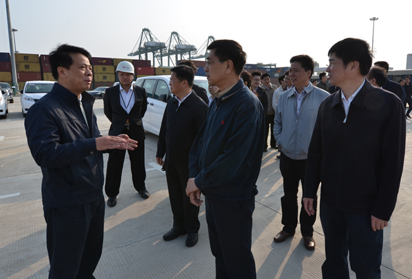 4月14日,在福州市市长杨益民、副市长吴贤德的陪同下,由国家发改委地区经济司副司长邹勇带队的国家发改委支持福建发展工作调研组一行莅临福港集箱江阴港区视察。调研组现场视察了码头前沿集装箱作业区及整车进口堆场,期间,邹司长听取了福港集箱常务副总经理沈耀辉对福港集箱运营情况的介绍。