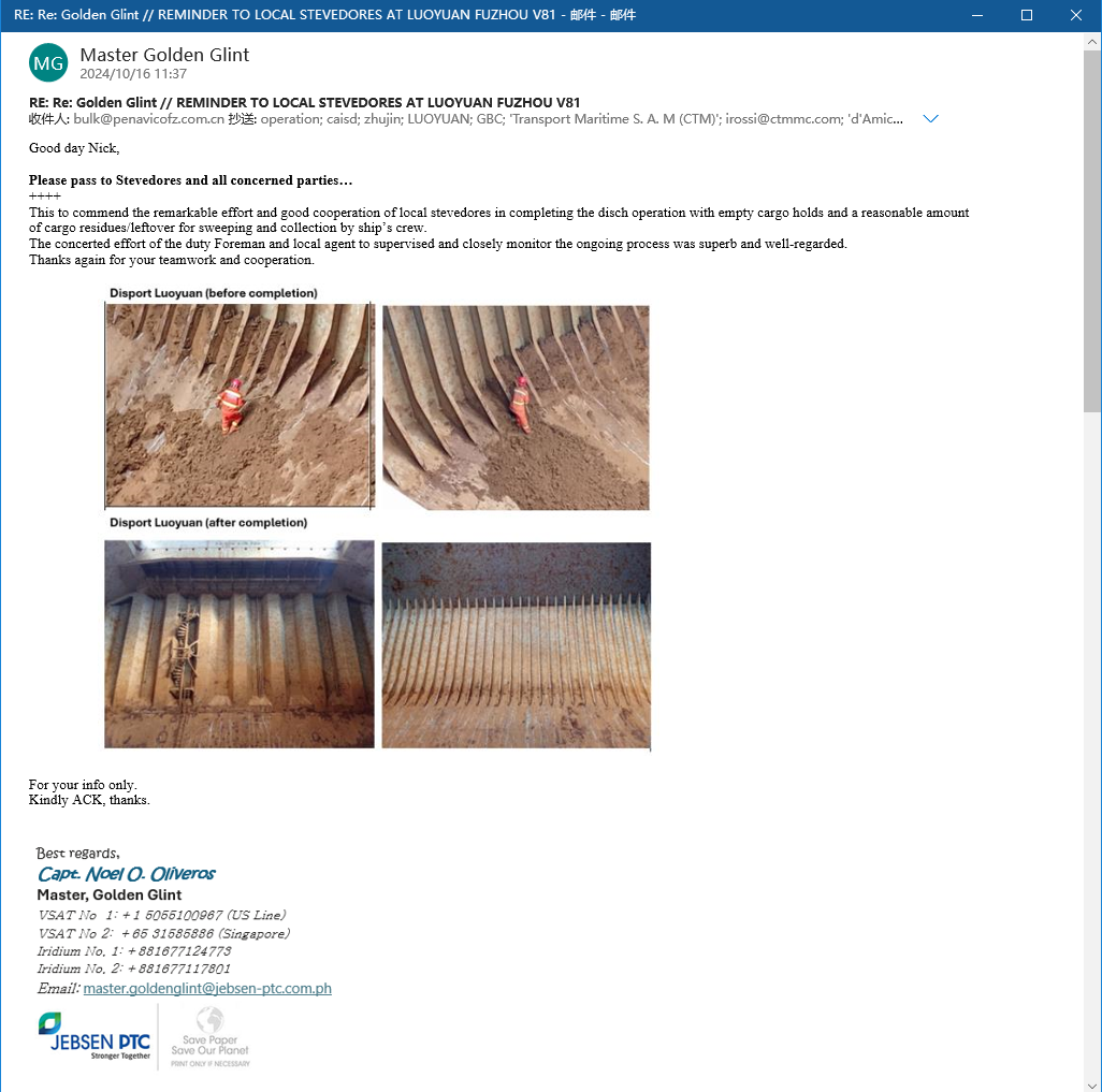 10月30日,随着镍矿轮“长航沧海”顺利离泊,北岸福港罗源湾高效完成单月镍矿船舶速遣离港。进入四季度,公司积极开展百日攻坚行动,国庆期间台风“山陀儿”对临港物流供应链产生较大影响,公司未雨绸缪布置灾后生产组织,加快锚地船舶靠泊进度,提前组织设备设施检修,全力以赴备战镍矿船和原辅料船延迟到港压港,并投入“科技兴安”——无人机智慧巡检项目,完善在港镍矿货料防雨、货损管控等货运质量细节,在短短12天内接连抢卸6艘次镍矿船舶并实现速遣离港,帮助客户节省约14万美元物流成本,刷新单船平均效率1530吨/小时的历史纪录,以优质高效的服务质量赢得厂家和船方赞誉,其中外轮“瑶光”号船长还特别发来感谢信,感谢福港罗源湾公司在执行货物卸货过程中提供的专业作业团队和优质高效服务,共同完成了本航次卸货计划。