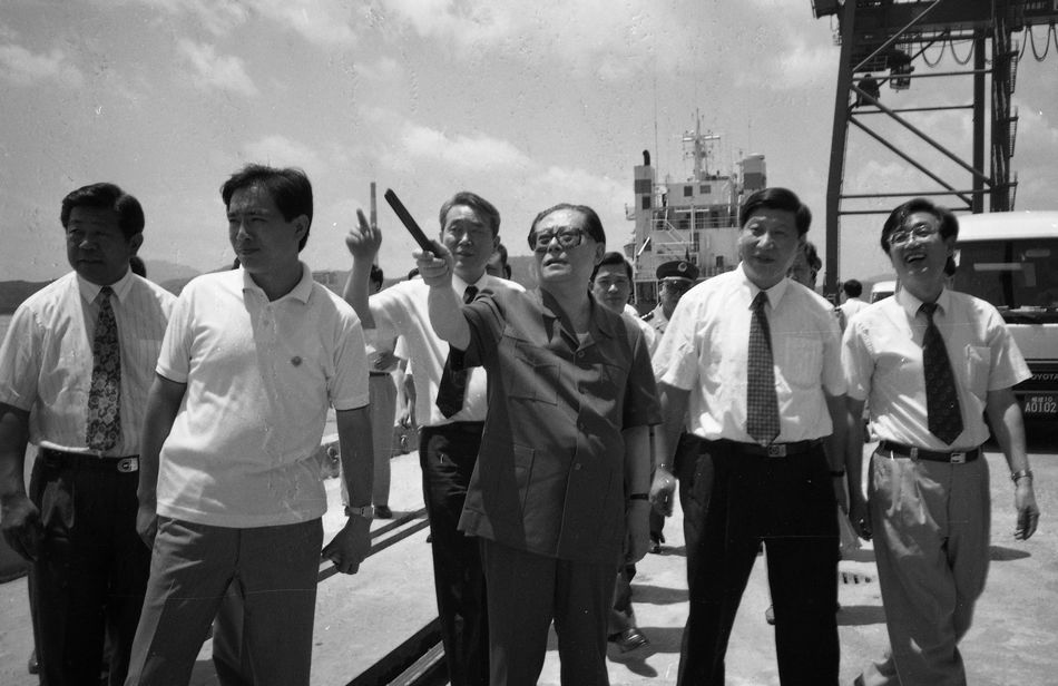 ▲1994年6月26日,时任福州市委书记习近平陪同江泽民同志,在福州港视察工作。