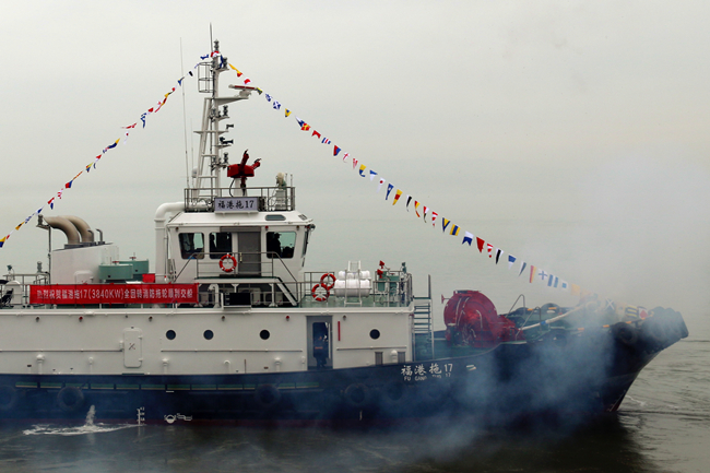新投入的“福港拖17”是福州港拖轮板块划转福州港务集团后所建造的第一艘大马力拖轮。该船长39.08米,设计吃水3.8米,航速可达13.5节,拖力62吨,消防炮射程120米,是目前福州港拖力最大、技术最优、设备最新的消防拖带两用拖轮。该拖轮由浙江凯灵船厂建造,属地两级政府、口管管理部门和相关码头业主提供了有力支持。新拖轮交付使用后,将立足福州市建设海上福州和交通集团做大做强江阴港区战略,满足江阴港区西部化工码头、沿海航区拖带及消防抢险等安全服务的需求,填补江阴港海上消防救援力量的空白,增强江阴港区的拖带和消防能力,为服务福州港的建设和发展作出应有的贡献。
