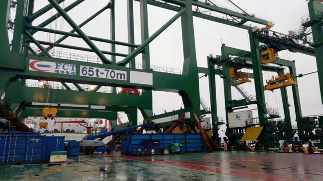 由“振华31”号运输船舶承运的福州港务集团所属福港集箱江阴港区2台岸桥和5台场桥于2018年12月16日11:15时顺利靠泊在江阴港区2#泊位。