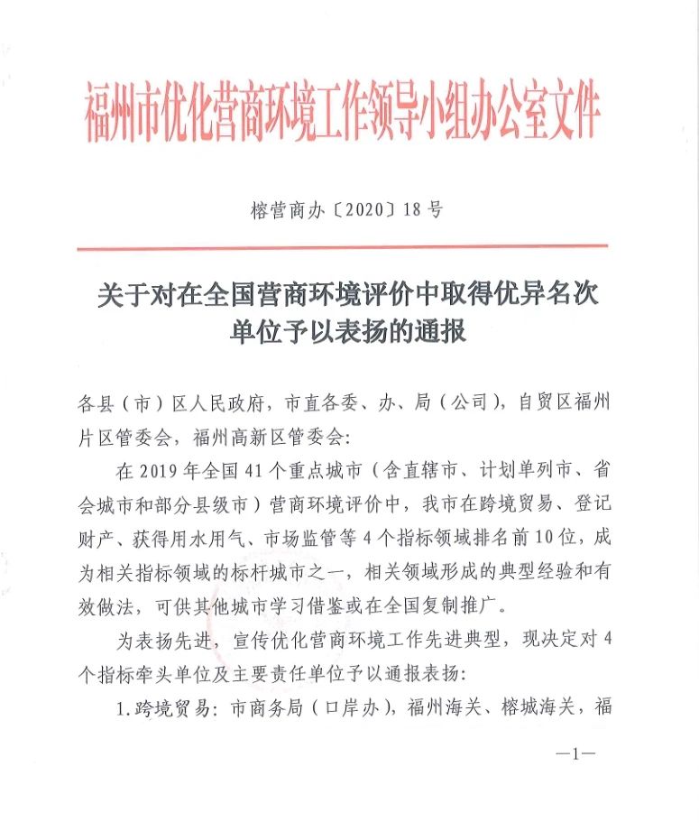 日前,福州市在全国41个重点城市营商环境评价中,在跨境贸易、市场监管等4个指标领域排名前10位,成为相关指标领域的标杆城市之一,提供了可复制推广的典型经验和有效做法。