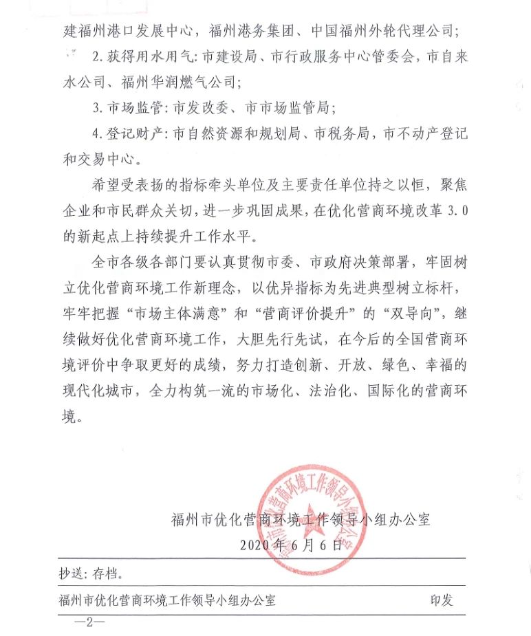 福州市优化营商环境工作小组进一步对相关指标牵头单位及主要责任单位进行了通报表扬。福州港务集团在跨境贸易领域的工作成效获得肯定。