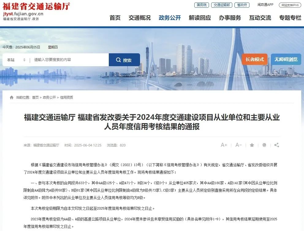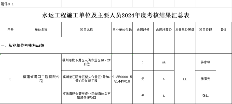 6月4日,福建省交通运输厅、发改委发布了《关于福建省交通建设市场2024年度信用考核为AA、A级从业单位及从业人员中标及信用结果适用情况的公告》,福建省港口工程有限公司再次获评福建省水运工程施工单位及主要人员信用考核AA级,这是公司连续3年获评AA级水运施工企业,既是行业主管部门对公司专业技术水平、项目管理水平和履约能力的高度认可,更为公司今后参与重大项目投标、拓展区域市场奠定坚实基础。 作为省属交通系统重要的国有施工企业,港口工程公司始终秉承“敬业、务实、诚信、高效”的经营理念,坚持与国同运、与港口事业发展同频共振、同向同行的发展之路,深耕属地经营,不断塑强专业品牌,在投身我省港口经济建设中积极履职担当。 |