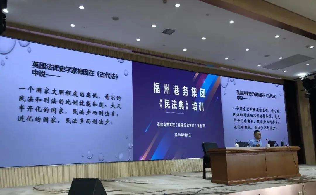为做好《民法典》普法工作,9月9日上午,福州港务集团举办了《民法典》专题培训讲座,邀请福建省委党校福建自贸试验区研究院执行院长、法治研究中心主任王利平副教授授课。集团总法律顾问林建民副总经理主持学习并作讲话,集团及所属单位中高层管理者、相关部门人员共计122人参加了培训。