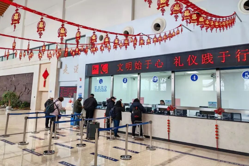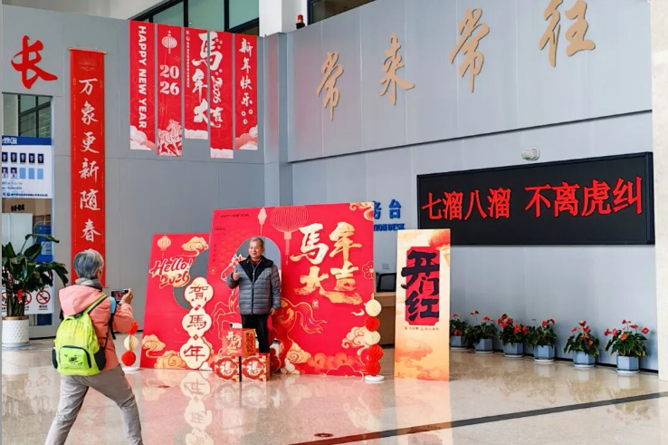 步入客运站,红绸飘舞、灯笼高挂、福字迎春,马年主题打卡点与新春暖心标语相映成趣,让归乡旅客沉浸在浓浓的年味里。