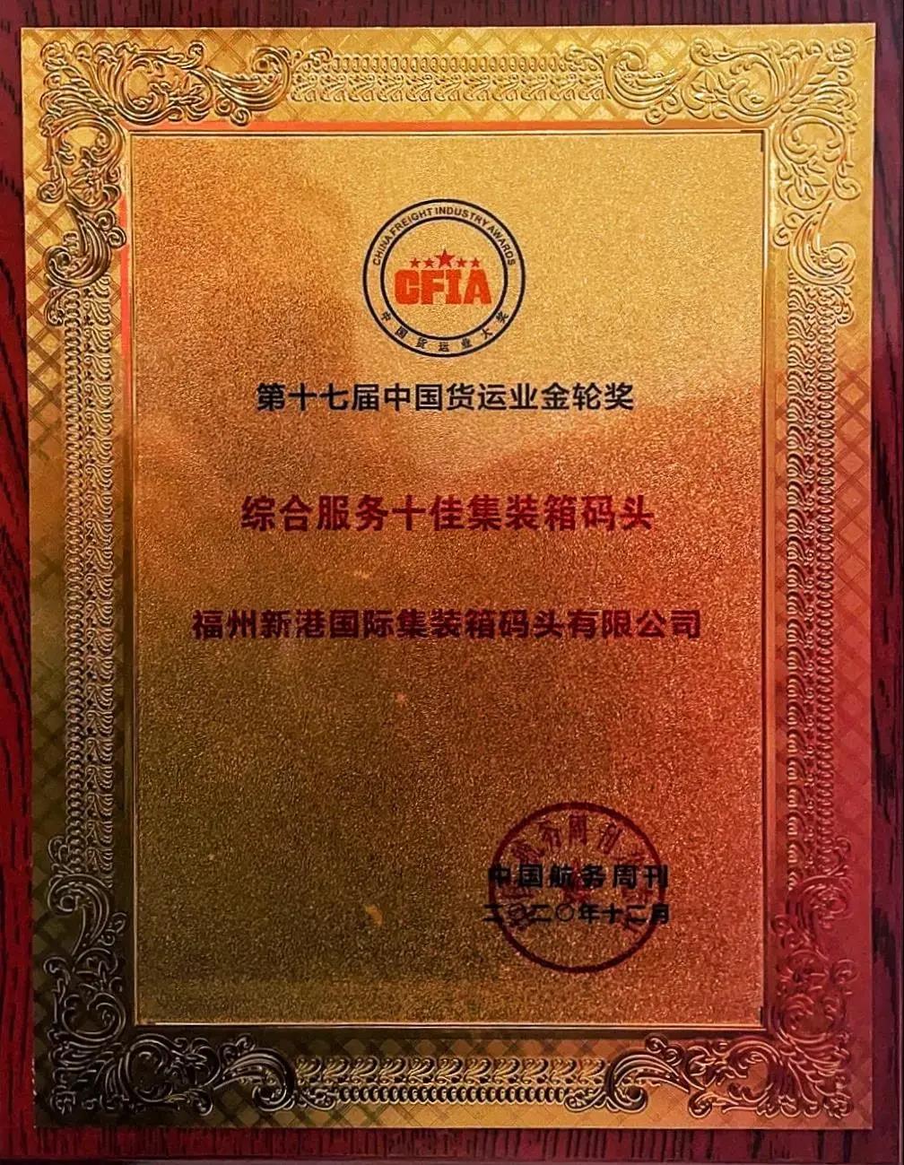 12月3日,从2020中国航运名人榜揭晓暨第十七届货运业“金轮”奖颁奖盛典现场传来喜讯,福港集箱旗下的福州新港国际集装箱码头有限公司再获“综合服务十佳集装箱码头”称号,这是福港集箱继1999年首获该奖项后,第十五次获此殊荣。