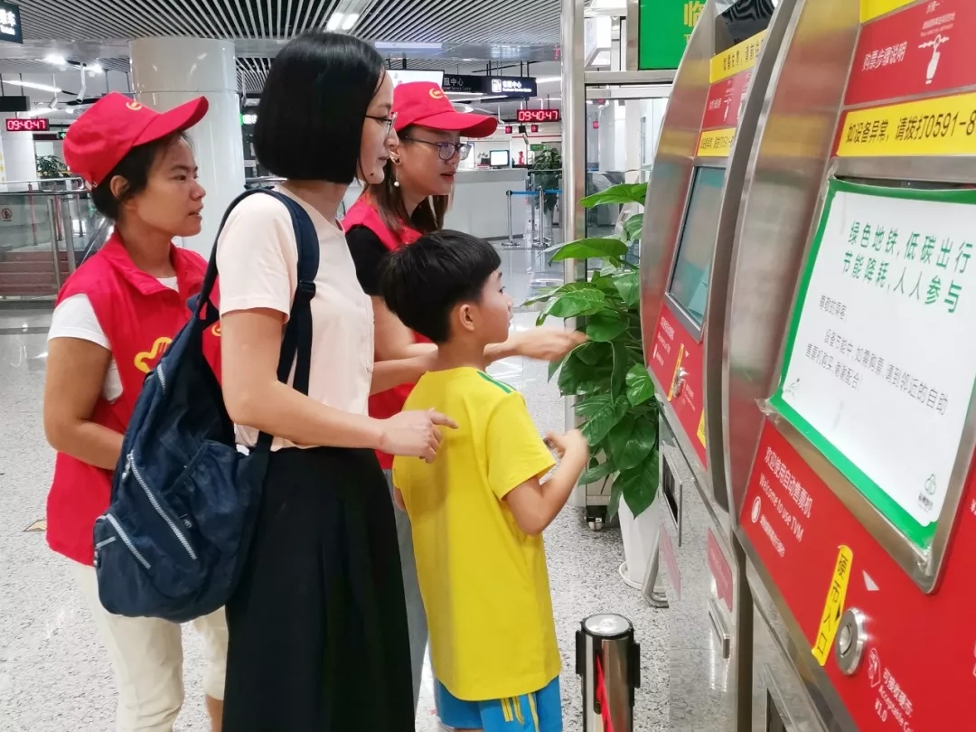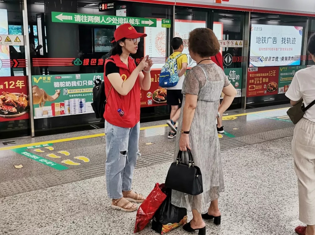 负责各个出口及扶梯的志愿者遇到很多行动不便的老人或携带过多行李的旅客,他们就会主动伸出援手帮助他们进出站台。而在闸机口的志愿者,遇到乘客屡次试刷车票无法通过的情况时,主动上前耐心细致地讲解和指导,直到乘客们顺利通过闸机口。正值周末,而且处于暑假旺季,地铁站的客流量也比平常大了许多,有的乘客不清楚目的地乘坐路线、不知道如何转乘以及零钱不足的情况常有发生。这对在售票机处进行志愿服务的志愿者不仅要简洁明了地与乘客交流,还要能够帮助乘客确定路线购买车票,他们细致入微的服务赢得了乘客的点头赞许,连声“谢谢”。