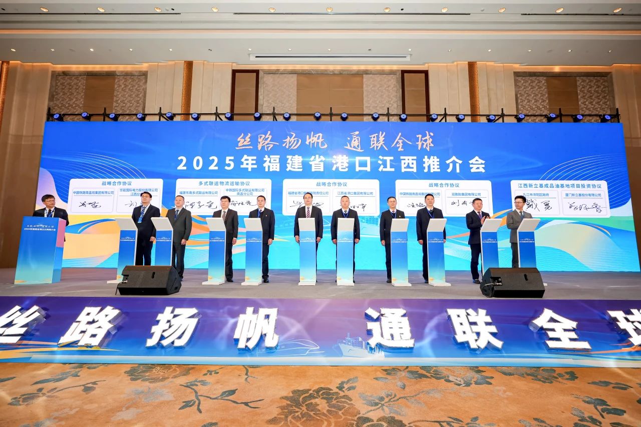 推介会上,福建省交通运输厅详细介绍了福建港口发展现状、未来规划以及服务江西企业的具体举措。近年来,福建省委、省政府高度重视港口发展,着力打造世界一流港口,沿海港口已开通集装箱班轮航线超310条,其中外贸航线超160条,覆盖全球主要港口。多式联运班列覆盖南昌、赣州、上饶、高安等城市,南昌-厦门、赣州-厦门等海铁联运线路稳定开行,“昌厦一港通”高效集装箱物流路径打开了江西货物出海快捷通道。“十四五”以来,闽赣海铁联运集装箱运量迅速增长,从2020年的4.82万标箱,增至2024年的13.59万标箱,同比增长近2倍,为两省经济高质量发展提供了强有力的物流支撑。