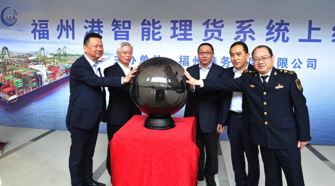▲福建交通集团陈乐章副总经理(左3)、榕城海关黄健副关长(左2)、中联理货有限公司王科总经理(右2)、福州港务集团陈剑钟董事长(左1)、福州海事局江阴海事处阮召彬处长(右1)共同启动智能理货系统。