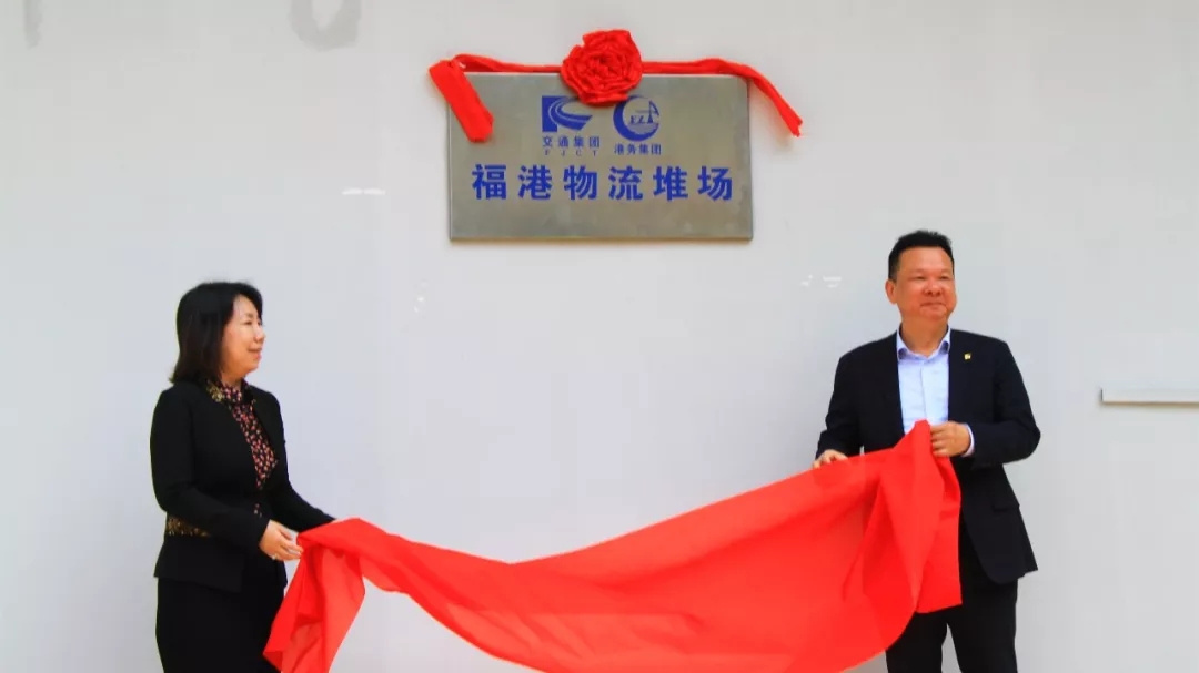 ▲厦门中远海集装箱运输有限公司常务副总经理康燕(左)、福州港务集团董事长陈剑钟(右)共同为箱管堆场揭牌。