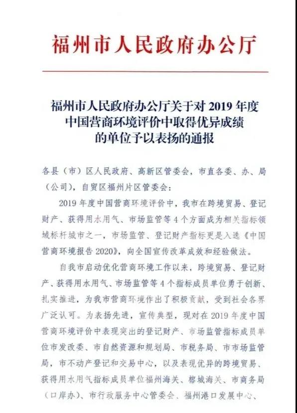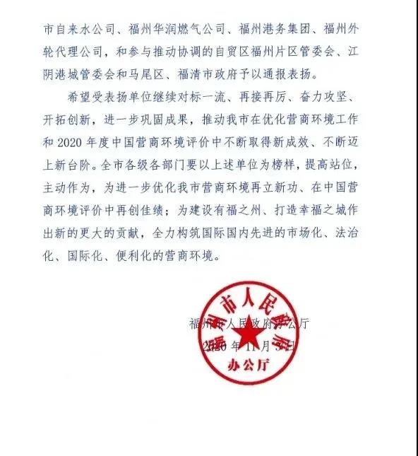 福州市人民政府办公厅进一步对2019年度中国营商环境评价中表现突出的相关指标牵头单位进行了通报表扬。福州港务集团将以此为契机,持续提升服务水平,大胆先行先试,为进一步优化营商环境再立新功!