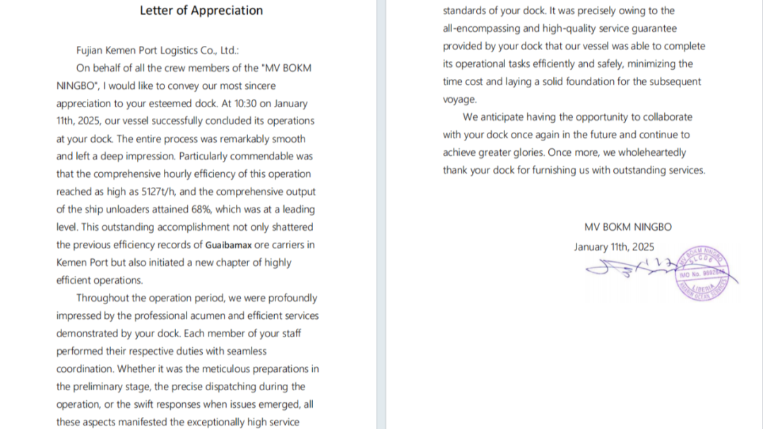 2025年1月11日,可门港开门红首战告捷——30万吨级“布克宁波” 轮用时61.83小时完成全船铁矿接卸,创下船时效率5127吨 /小时、单班作业量75000吨、30万吨级外轮在泊时间70.58小时的傲人业绩,刷新三项纪录,奏响新一年蓬勃发展的激昂序曲。船东发来热情洋溢的表扬信对可门港的服务表示肯定和感谢。