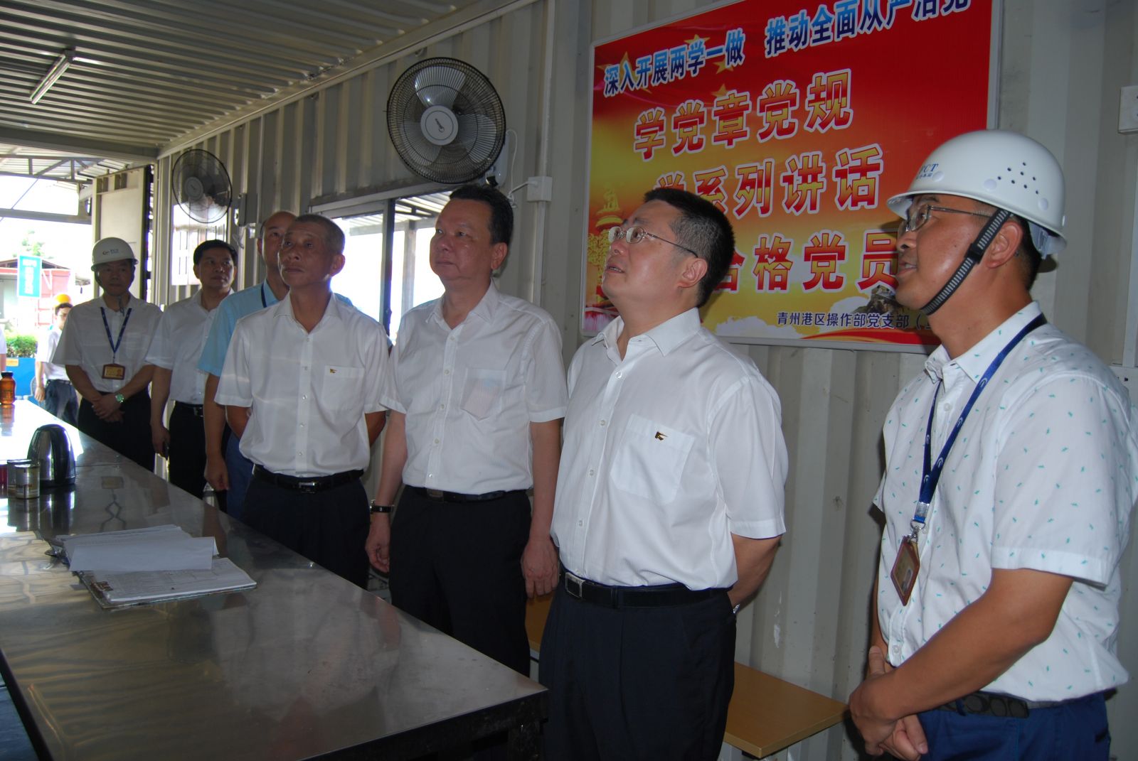 6月22日上午,交通集团李兴湖董事长、陈乐副总经理、党群部潘在奇主任一行来到福港集箱青州港区操作部“两学一做”学习教育联系点开展调研。在福州港务集团陈剑钟总经理、郑明副总经理和福港集箱党委班子成员的陪同下,深入码头现场、计划科、中控室查看“两学一做”学习教育的宣传贯彻情况以及生产一线员工的工作情况以及操作部党支部党员之家、职工小家的建设情况,主动与公司员工亲切交谈,并给予关心慰问。