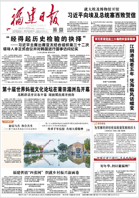 11月3日,《福建日报》头版刊登“学习贯彻党的二十届四中全会精神”主题报道——《江阴港城看五年 凭海临风话蝶变》。走进福州港江阴港区,展现港区“十四五”发展成效,展望“十五五”发展蓝图。