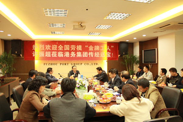 12月18日,全国劳模、“金牌工人”许振超莅临福州港务集团传经送宝。集团陈乐章总经理、黄长周书记带领集团先进模范及本部职工热情欢迎许振超同志。