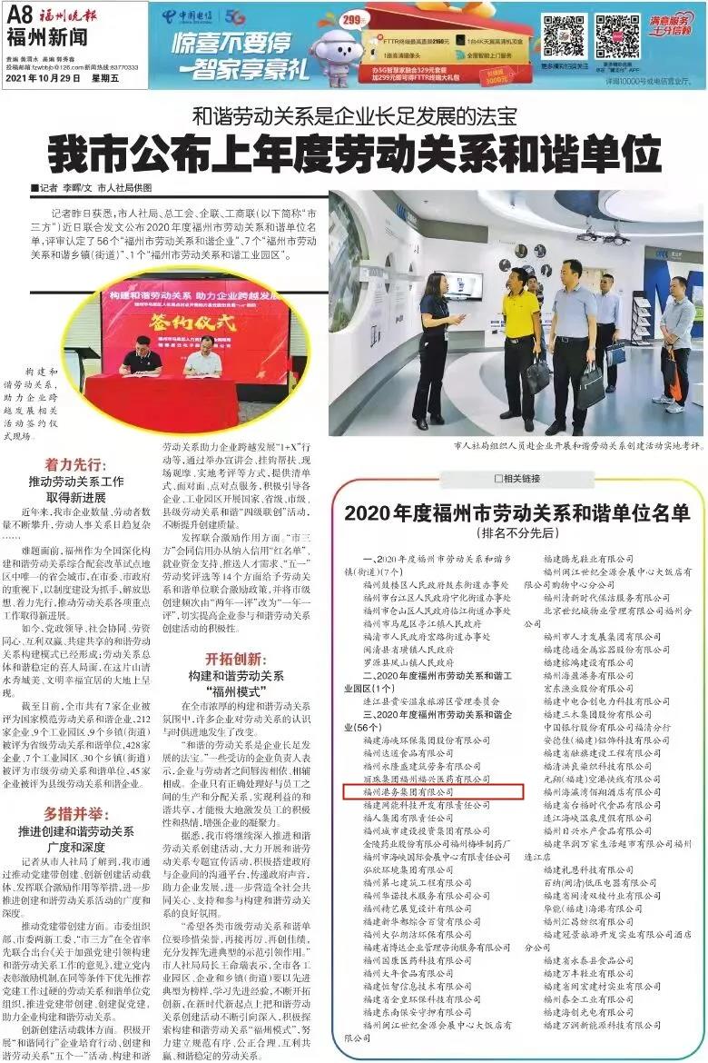 近日,福州市人力资源和社会保障局、市总工会、市企业与企业家联合会、市工商业联合会授予福州港务集团有限公司“2020年度福州市劳动关系和谐企业”荣誉称号。