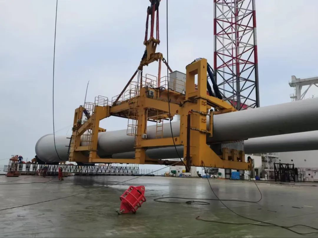 项目执行过程中,公司工程团队努力克服两大技术难题:123米超长叶片的精准吊装与船舶固定和易受天气影响的海上运输,精确把握作业窗口期,量身定制了"全链条运输方案"。运输船舶“远瑞大件”轮抵港后,采用履带吊双抬工艺,24小时内完成4支叶片的装船和多重防护固定作业。运输期间,团队通过实时监测系统跟踪船舶姿态和海况,历时3天安全抵达目的地,实现了叶片"零货损、零延误"。