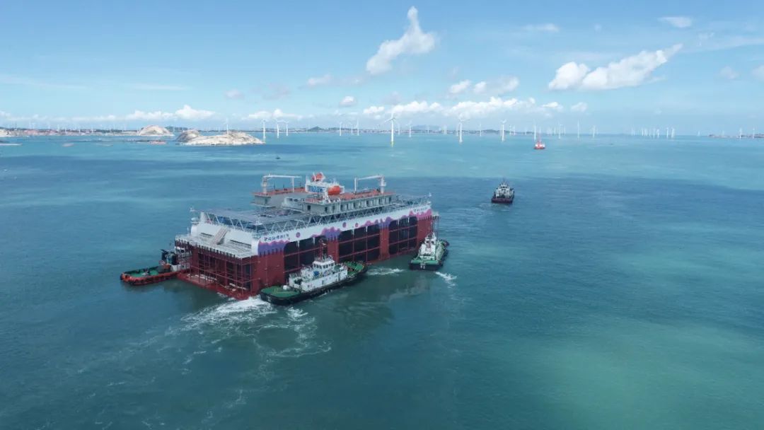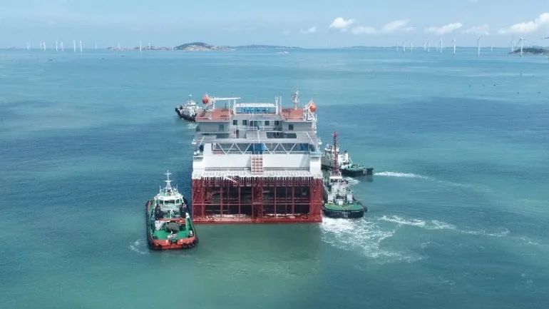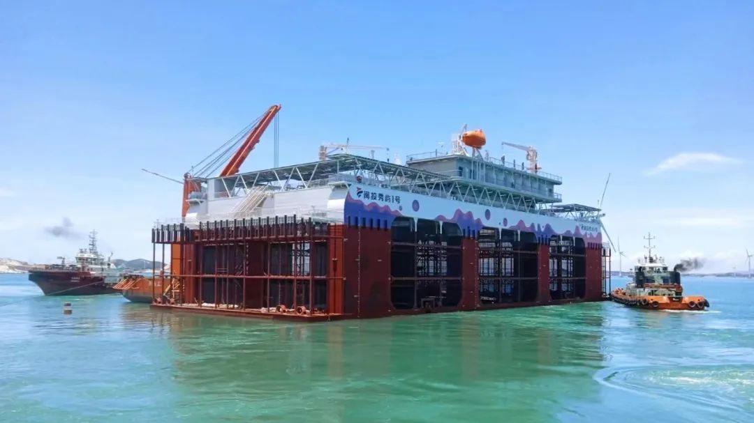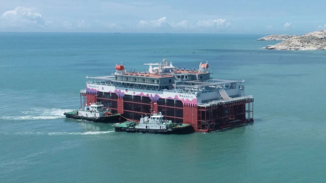 6月26日,在福港拖轮“榕拖12”轮与“福港拖18”轮高效协同下,莆田首座深海智慧渔旅养殖平台“闽投秀屿1号”被稳稳拖带至秀屿区南日岛东岱湾海域。