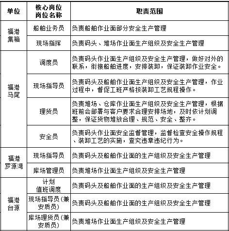 “一线安全生产关键岗位”承担着作业现场生产组织和安全管理的重要职责,是企业安全生产的最前线,也是保障企业安全生产最重要的一道关卡。根据集团“每条作业线、每个作业面要有自己的人在场管理”的要求,前期集团各职能部门及福港马尾等四家码头单位经过多轮调研、讨论,最终确定了现场指导员、船舶业务员等11个关键岗位。