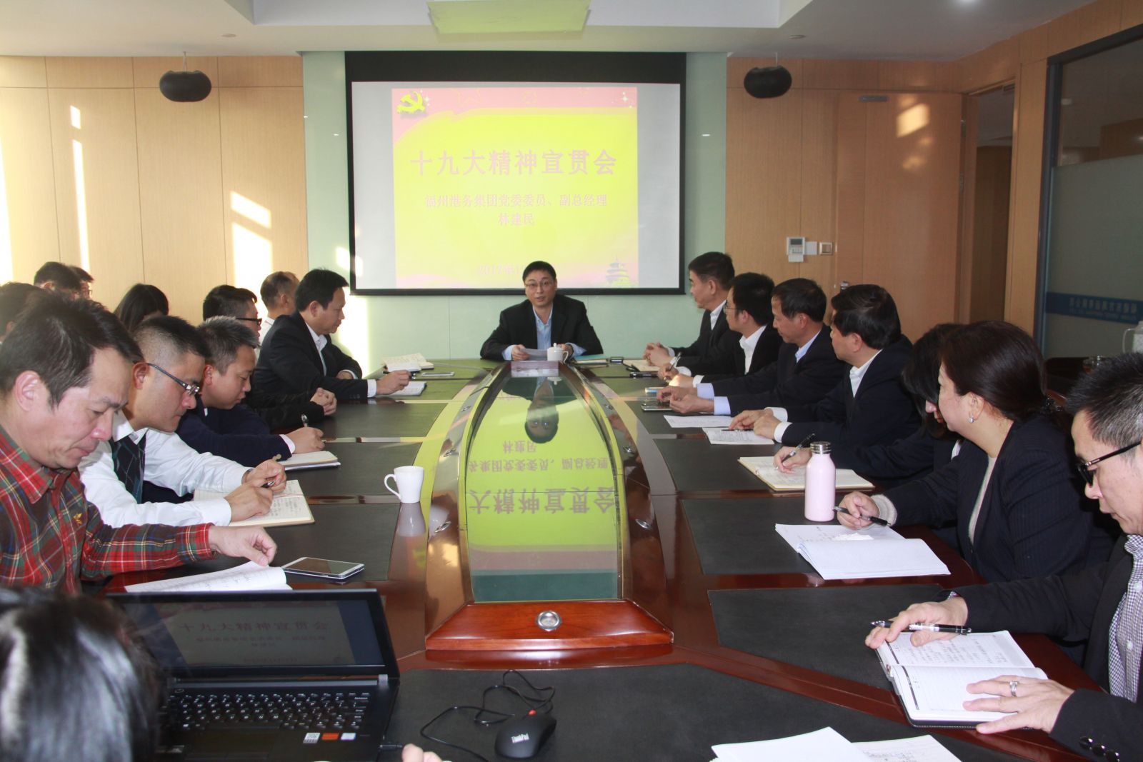 为推进党的十九大精神走进基层,在一线落地生根,集团党委切实开展党委领导班子成员下基层宣讲党的十九大精神活动。11月29日至12月8日,集团党委书记、董事长陈剑钟,党委副书记、副董事长罗卫东,副总经理林建民,纪委书记林家坚先后到福港集箱、福港拖轮、东方海运、福港台源,深入各单位基层党支部,围绕党的十九大精神的重要意义与深刻内涵、如何深刻领会党的十九大精神以及在中国特色社会主义新时代如何将党的十九大精神与具体工作紧密结合等问题为一线党员进行了生动形象,深入浅出的剖析,促进广大一线党员统一思想,凝心聚力。