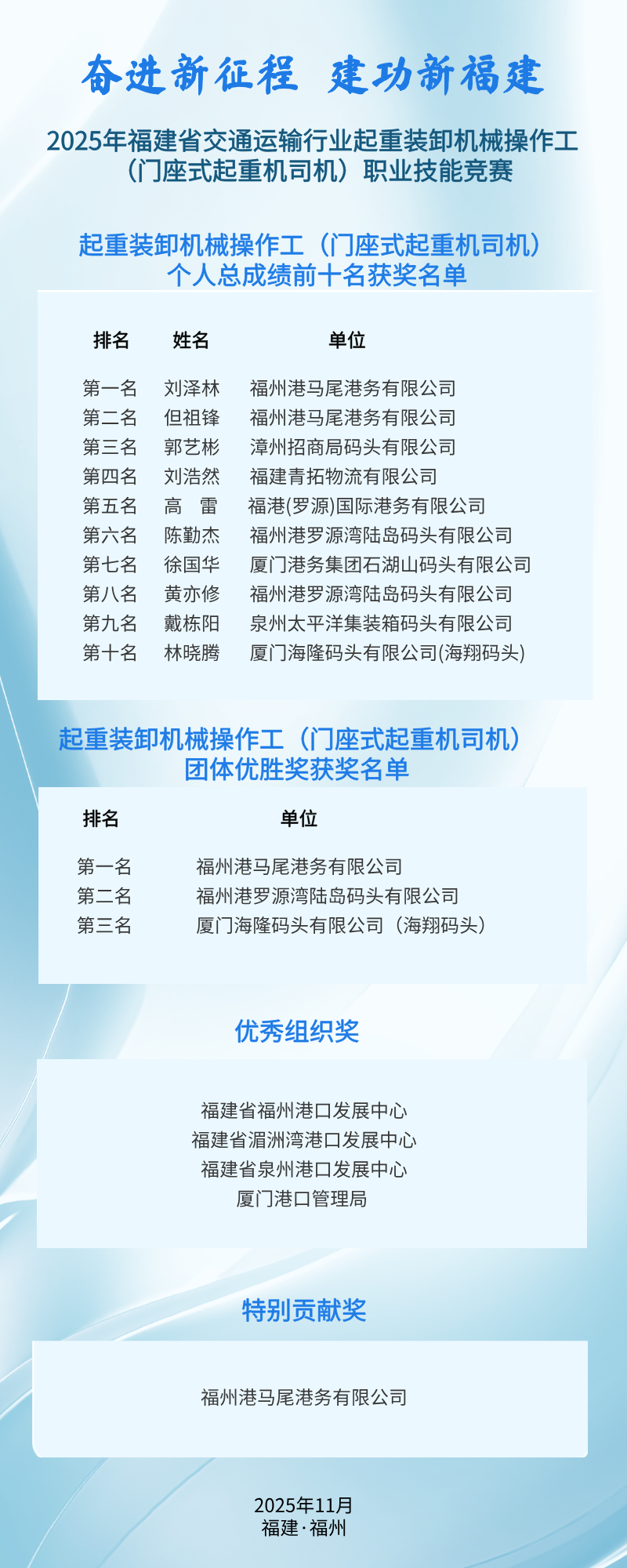 经过激烈比赛,最终产生了优胜团体和个人:福州港马尾港务有限公司、福州港罗源湾陆岛码头有限公司、厦门海隆码头有限公司(海翔码头)分获优胜团体一等奖、二等奖、三等奖。福州港马尾港务有限公司刘泽林、福州港马尾港务有限公司但祖锋、漳州招商局码头有限公司郭艺彬分获个人第一名、第二名、第三名。此次竞赛荣誉与职业技能等级认定相结合,个人总成绩排名前10名的选手将按规定申报相关荣誉、认定相关技能等级。
