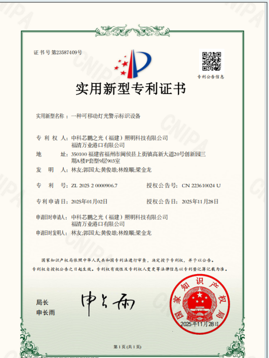 日前,福清万业港口有限公司自主研发的“一种可移动灯光警示标识设备”,获得国家知识产权局授予的实用新型专利证书。
