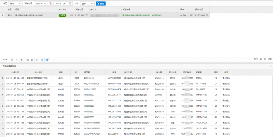 1月26日,福州港智慧港云平台上线了冻柜出场自动推送功能。该功能由集团下属单位福州迅腾信息技术有限公司开发,利用推送邮件的方式将港区码头的冻柜出场记录即时推送至相关监管单位,记录内的信息包括车队、拖车司机、司机联系方式等,监管单位、港区码头可以通过平台快速全面掌握冻柜动态信息,大大提高冬春季疫情防控响应的时效性、准确性,实现科技助力抗疫。