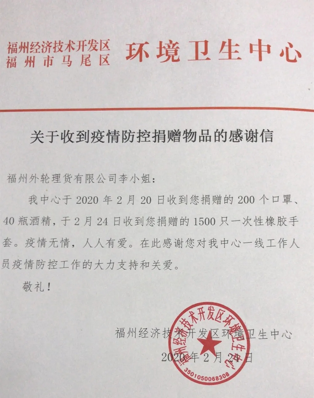 2月24日,福州经济技术开发区环境卫生中心对福州外理志愿者李秋菊捐赠防疫物资的行为发来感谢。在此次的疫情防控中,李秋菊作为“福建省五一巾帼标兵”和“马尾区优秀志愿者”,积极践行了志愿者精神。听闻环卫中心物资紧缺后,李秋菊同志积极联络各方资源,向环卫中心捐赠200个口罩、40瓶酒精和1500只一次性橡胶手套。