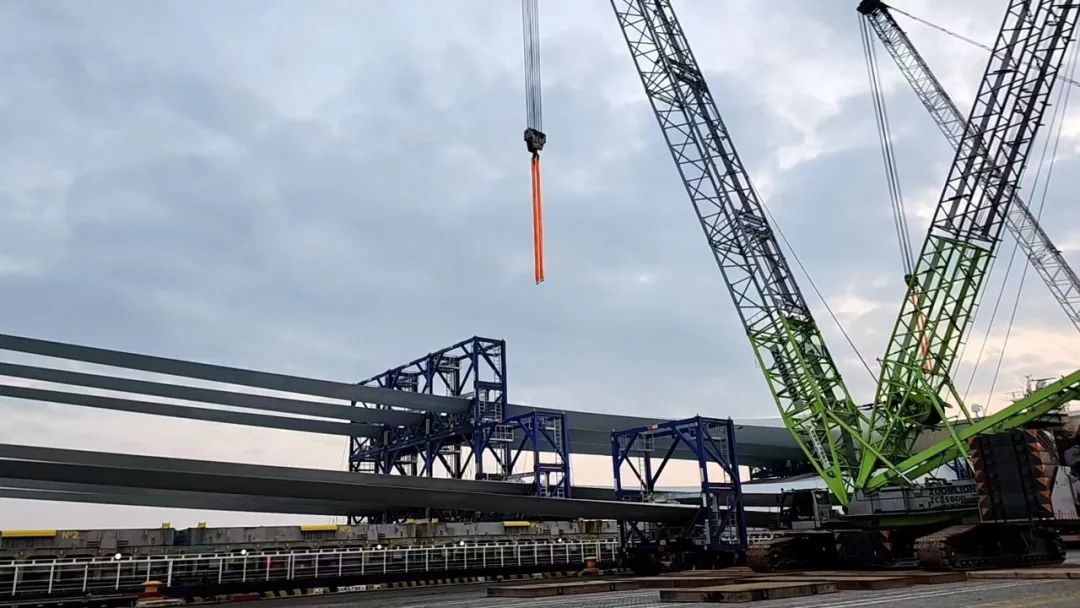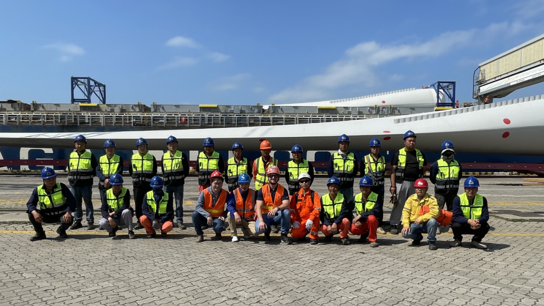 面对今年严峻的经济形势,公司经营团队主动发力,积极寻求新业务,觅得新能源出口商机。为确保业务顺利开展,公司与国外业主方、叶片制造商及国际权威监理机构通过密切沟通交流,经过几个月的方案论证与工艺优化,最终“量身定制”了一套专业化吊装作业体系。在船舶装载过程中,公司以“分组吊装、同步固定”模式,历经16小时完成首批8支叶片的吊装,全程实现零损伤、零事故。国外业主公司技术总监高度评价此次作业优于其他同类型作业场景,并在作业结束后亲自到访表示感谢。