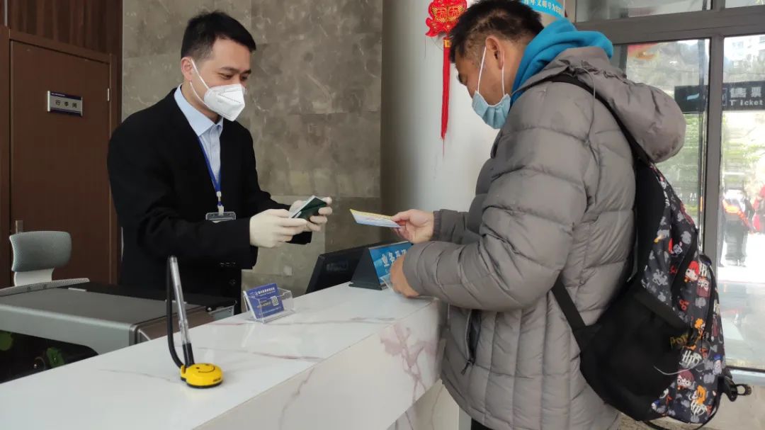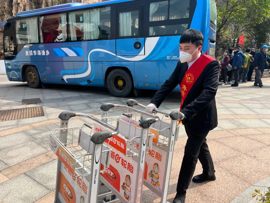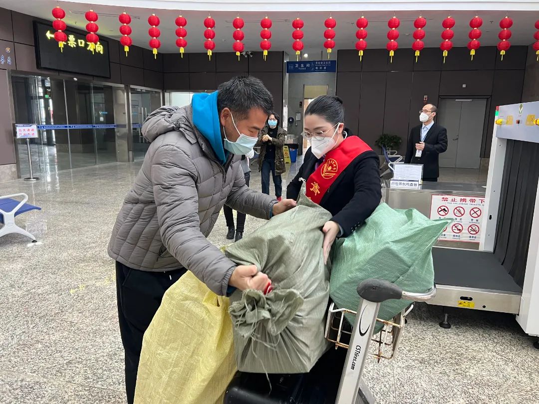 “温情服务”,志愿者为旅客提供便民服务 专线接驳客车