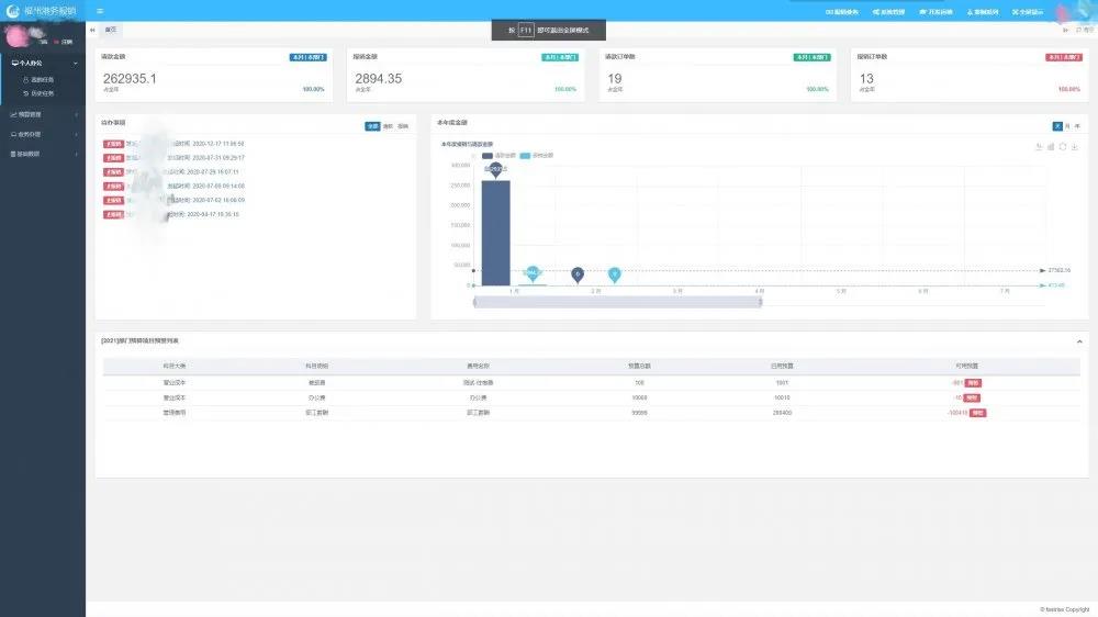智能财务系统实现预算控制,模块涵盖部门预算管理、预算执行情况分析以及年中预算调整等子模块,可查询每个项目的预算进展情况和部门预算执行情况,强化预算管理和控制。