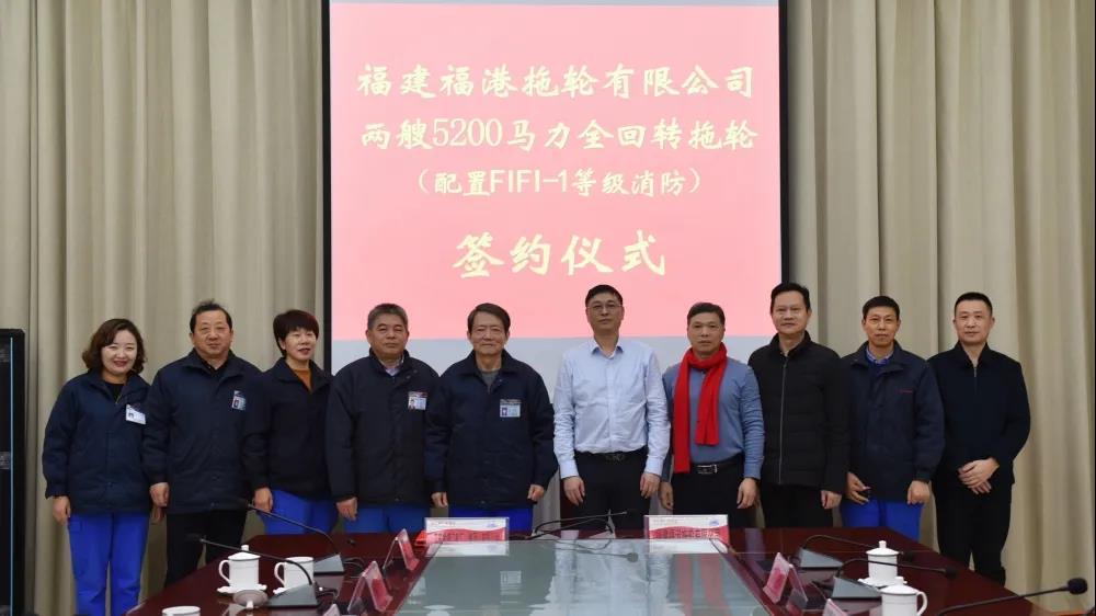 12月24日,福港拖轮与江苏镇江船厂(集团)有限公司在镇江举行合同签约仪式,福港拖轮公司总经理龚银春、镇江船厂董事长郭琰分别代表双方在2021年新建两艘5200马力(3840kw)全回转拖轮(配置FIFI-1等级消防)合同上签字。福州港务集团副总经理林建民出席签约仪式。