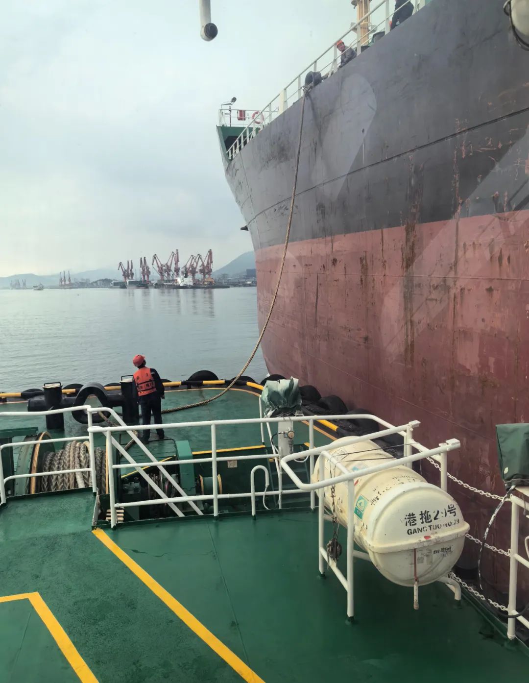 4月20日,福港拖轮所属“福州港拖29号”在福州港白马港区湾坞作业区成功开展助离泊作业。这是福港拖轮首次在该区域开展助泊作业,标志着福港拖轮服务保障能力持续提升,业务服务半径不断拓展。 为最大限度的保障客户需求,确保第一时间协助靠泊,当日12时,“福州港拖29号”提前到达指定位置。因前一艘船舶码头作业时间延长,直到16时20分,“远强锦绣”轮才缓缓驶入码头水域,“福州港拖29号”从左侧靠上大船完成带缆工作,并适时根据水流、风向等,与货船船长密切沟通,经过共同努力,17时30分,顺利帮助“远强锦绣”轮完成靠泊。