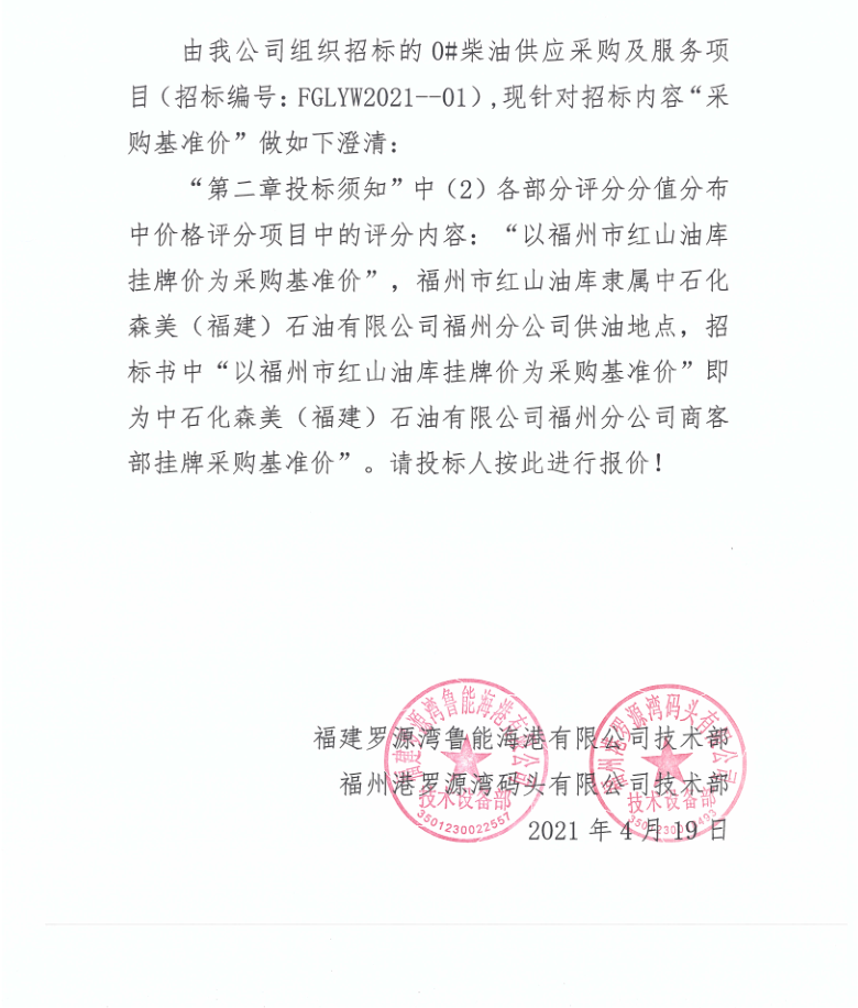 福港罗源湾关于0#柴油供应采购及服务招标文件内容“采购基准价”的澄清函